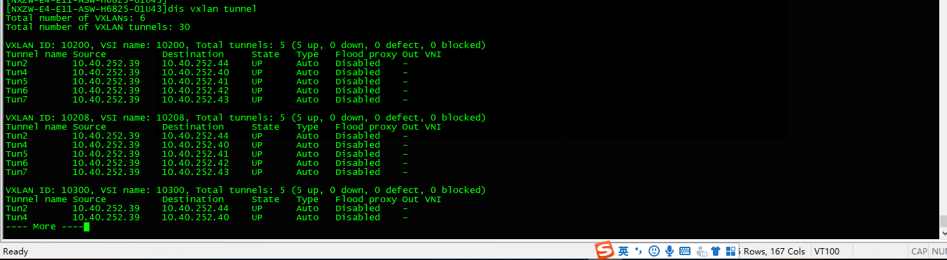 在B-leaf 查看vxlan隧道:可以看到和6台leaf(m-lag)隧道建立.