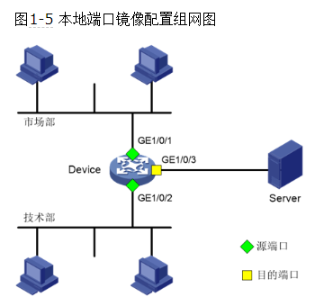· 通过配置源端口方式的本地端口镜像,使Server可以监控所有进、出市场部和技术部的报文。