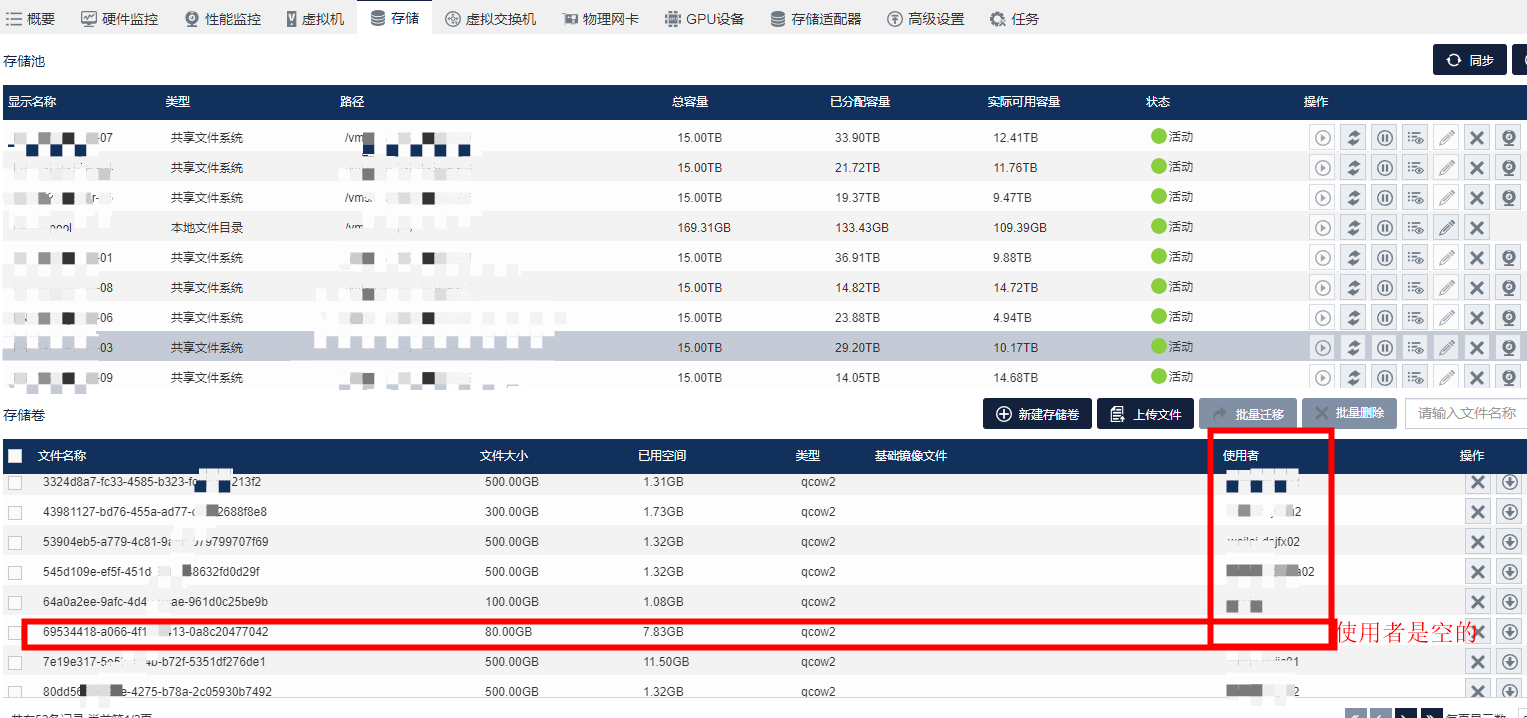 CAS存储里面看每个LUN的分配比,下面有详细分配情况,问题1:使用者是空的,是不是就是没有虚拟机使用,可以删除了。问题2:这个使用者是不是就是虚拟机的名字,使用者的名字找不到的,是不是也可以删除了。问题3:造成这种虚拟机已经删除,但是存储还在的原因是什么。请大神解答