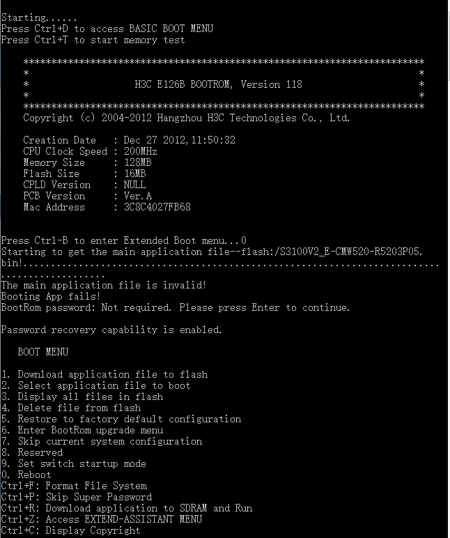 H3C E126B 掉电后启动失败,提示Booting App fails! 怎么办?