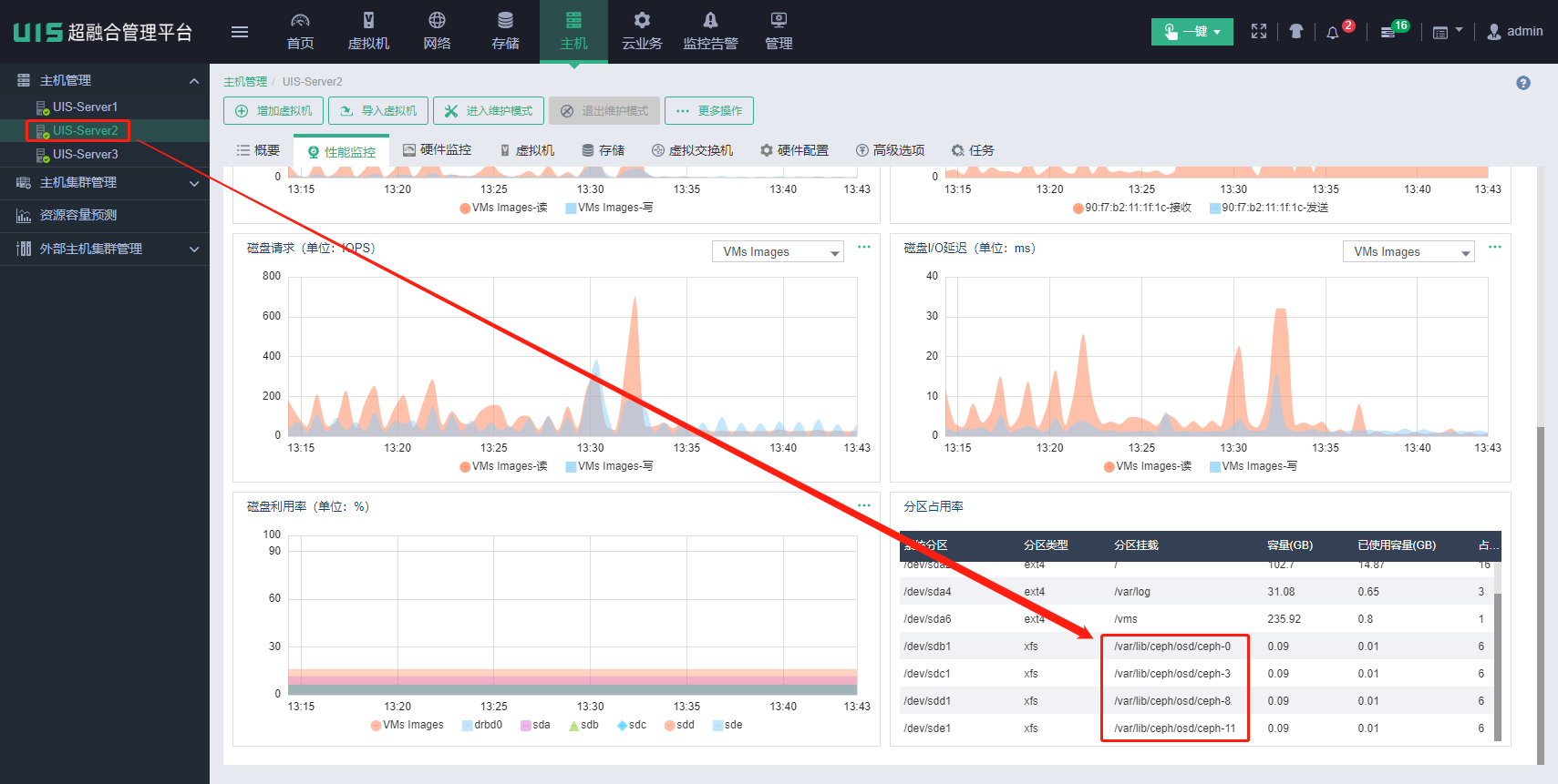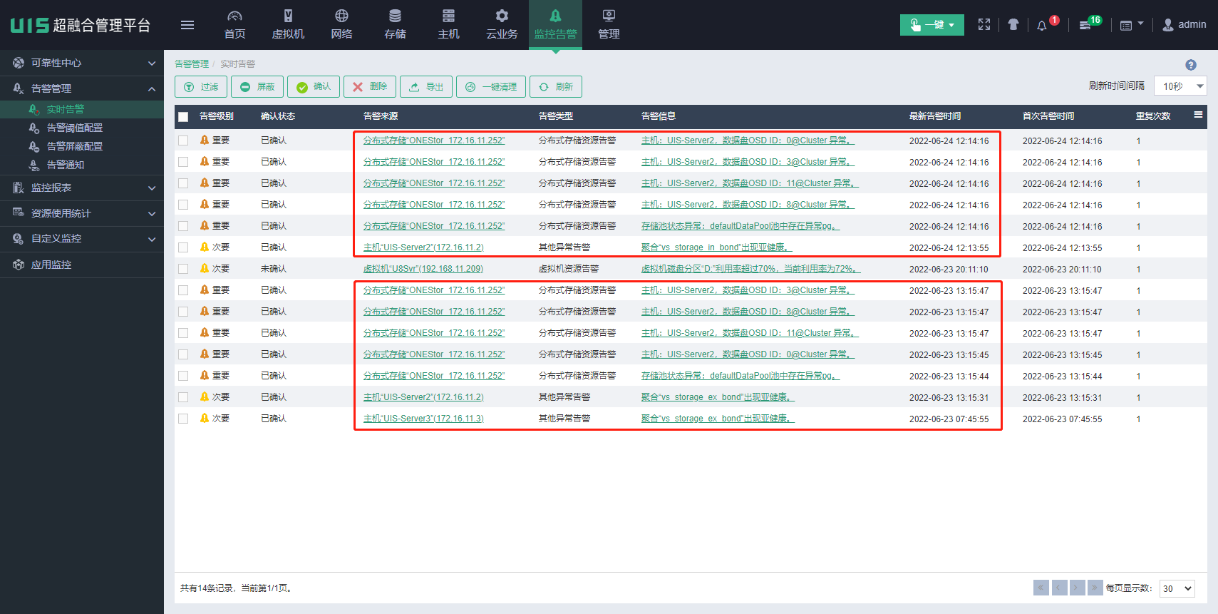 UIS 7.0 三节点超融合部署,每给节点4*10T 数据盘 ,2*480G 系统盘 ,2*480G缓存加速。连续两天报server2的所有数据盘 OSD@Cluster异常。平台虚拟机能正常使用。日前到不了客户现场,客户有报错截图。大神们帮忙看看问题大概在哪里?明后天上门处理用户端问题