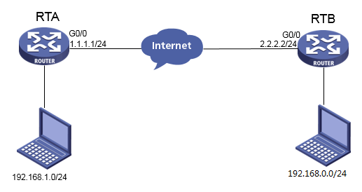 Router A使用ERG3路由器,Router B使用MER路由器,在两者之间建立一个安全隧道,对客户分支机构A所在的子网(192.168.1.0/24)与客户分支机构B所在的子网(192.168.0.0/24)之间的数据流进行安全保护,实现两端子网终端通过IPsec VPN 隧道进行互访。