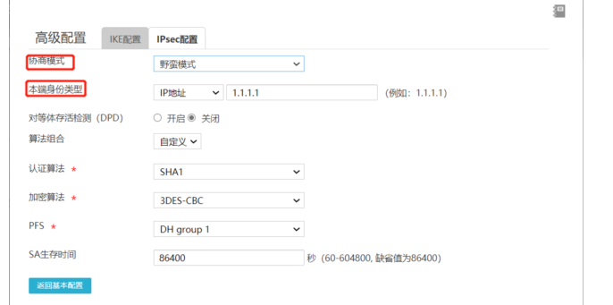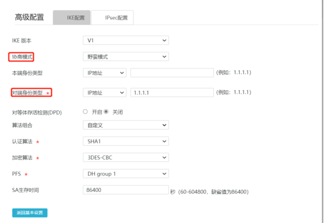#配置IKE,协商模式选择野蛮模式,对端地址为1.1.1.1,认证算法,加密算法,PFS分别选择SHA1,3DES-CBC,DH1,保证两端的算法一致。