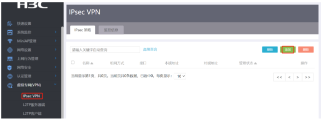 单击【虚拟专网】--【IPsec VPN】--【IPsec策略】, 点击【添加】