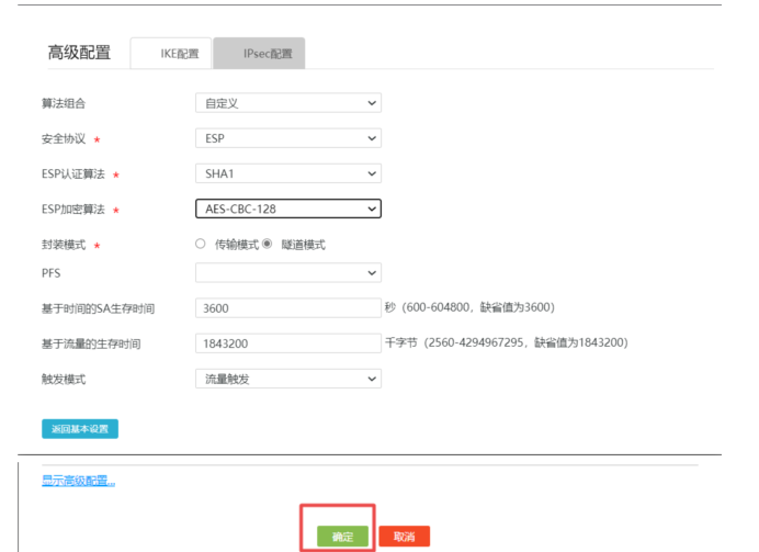 #配置IPsec,安全协议选择ESP,认证算法选择SHA1,加密算法选择AES-CBC-128,并保证两端算法一致。