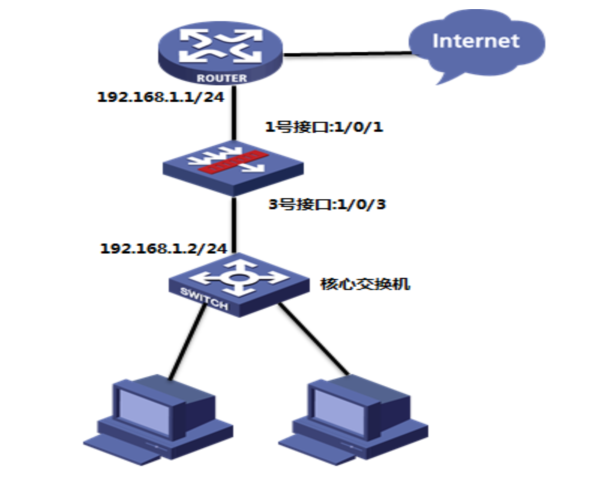 如下组网图所示,在原有的网络中增加防火墙来提高网络安全性,但又不想对原有网络配置进行改动,所以需要防火墙采用透明模式部署;其中GigabitEthernet 1/0/1接口接原有路由器的下联口,GigabitEthernet 1/0/3接口接原有的交换机上联口。