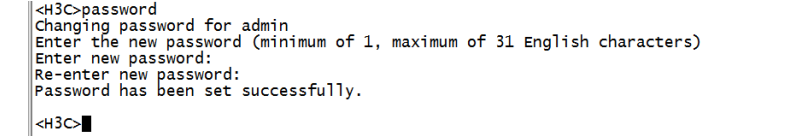 <H3C>提示进入设备命令行,输入password命令并回车,按照系统提示,提示:enter new password(输入新密码),则可以直接输入新密码,并重新输入一次确认即可。
