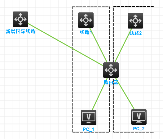 现新增一条国际外网线路,需求:如PC1,PC2需要访问国际外网时则走国际线路,且同时不影响现有的国内两条线路正常访问,这种该用什么样的办法可以实现呢?
