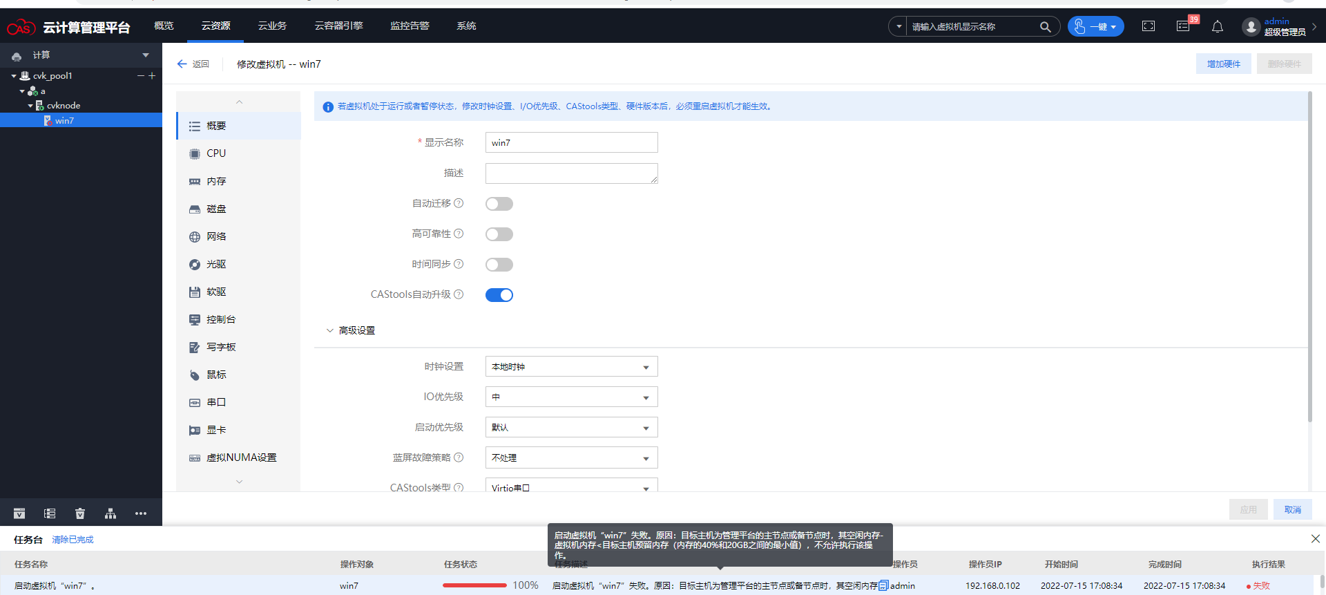 CAS搭建好了,虚拟机一直起不来怎么回事?说主机预留内存太小了,但是没找到在哪里设置主机的预留内存