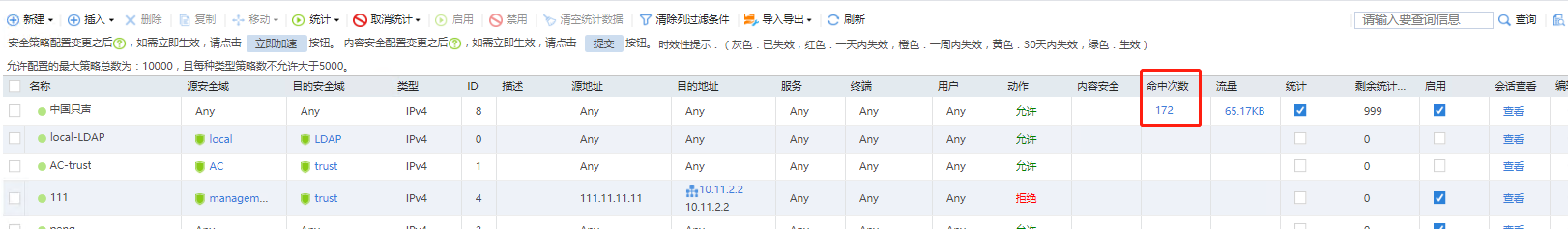 在监控——会话列表里面可以看到会话,最后一列是命中的策略id。