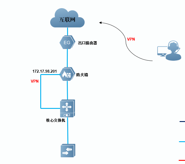 现在就是搞不明白IP接入口的概念,还有客户地址池怎么配置,感觉这两个配置好了,理论上能给终端拿到地址,然后终端的数据经过隧道到防火墙,然后再通过管理口走路由就可以正常访问内网的资料。简单拓扑图如下