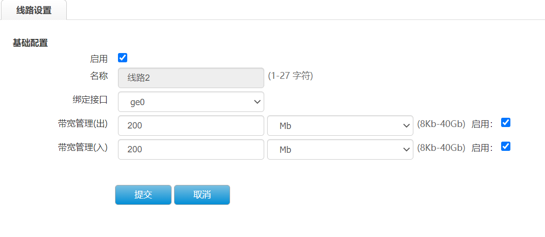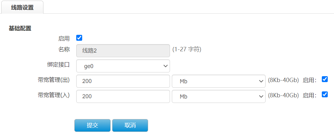 客户 有线 使用 线路1 ,无线 使用 线路2 ,ACG1000-EE(ge0接外网,ge1接内网)上创建线路1 和线路2 ,可是不能绑定到相同的出接口ge0上,而