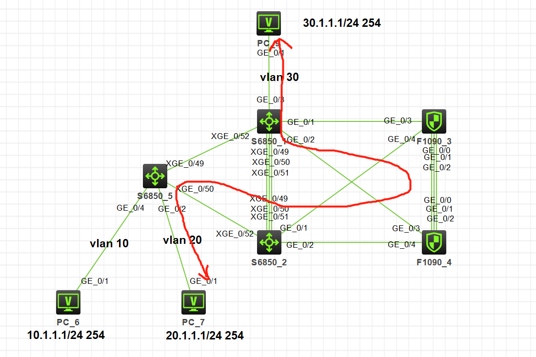 SSW1和2做堆叠,防火墙做主备rbm+vrrp,防火墙起三层聚合并启用子接口。30.1.1.1访问20.1.1.1时需做nat转换成20.1.1.10.这个nat要这么做?