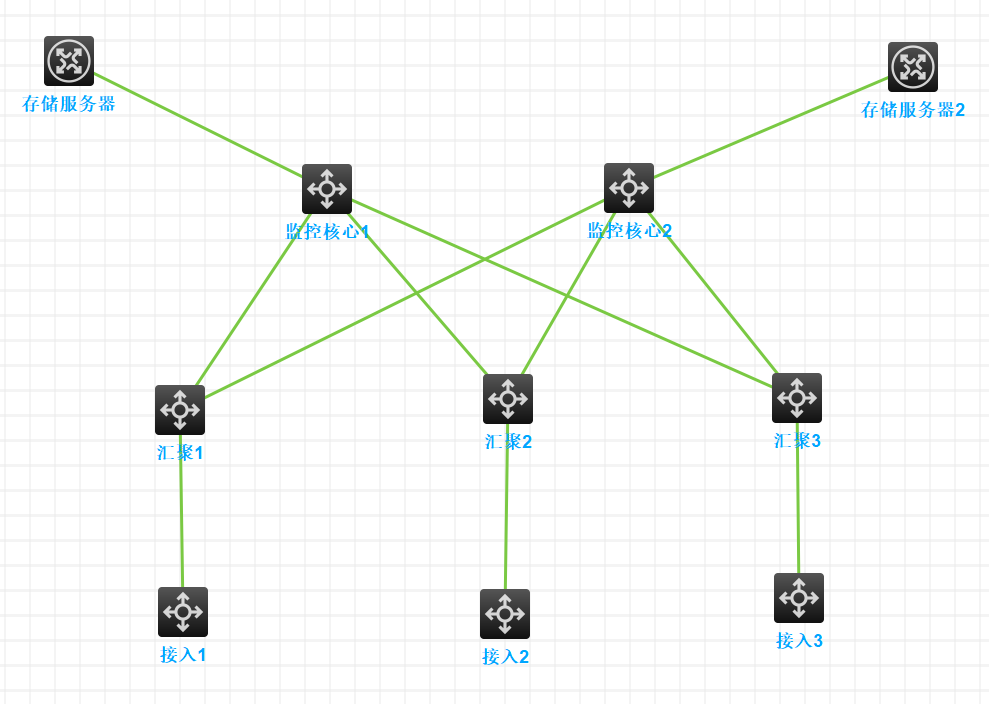 网络需求如下:整个监控网络总共有五个网段,一个是给存储单独的网段,这个网段可以和其余四个网段互通,其余的四个监控网段除了和存储网段相通以外和其它三个网段是不能通的。
