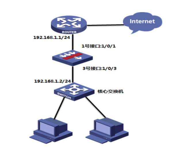 如下组网图所示,在原有的网络中增加防火墙来提高网络安全性,但又不想对原有网络配置进行改动,所以需要防火墙采用透明模式部署;其中GigabitEthernet 1/0/1接口接原有路由器的下联口,GigabitEthernet 1/0/3接口接原有的交换机上联口。