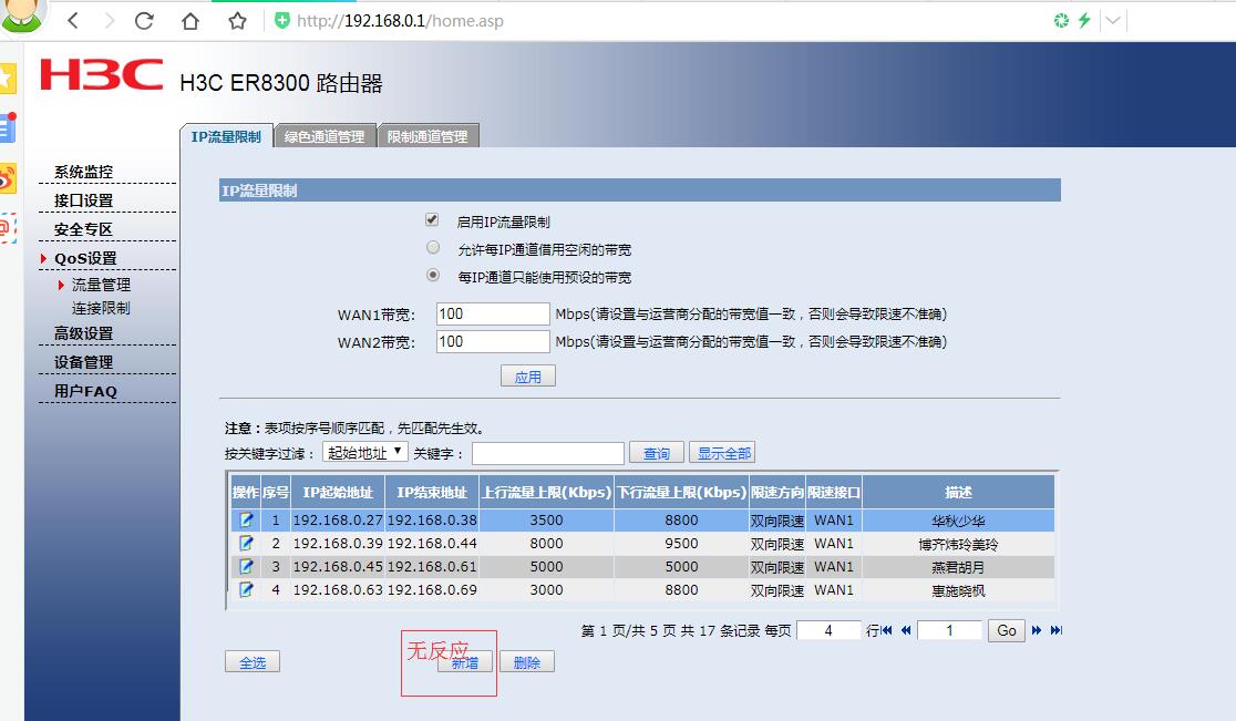 H3C ER8300路由器的后台管理系统的Qos的ip流量限制的新增菜单,点击无反应。公司的IP流量限制需要调整,但点新增菜单和编辑菜单一直无反应,到机房拔掉电源线再插上电源线,再登录路由器后台管理系统,问题依然存在,请如何解决?