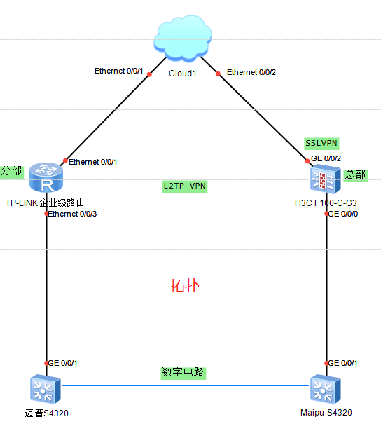 总部专线入网,分部联通拨号入网,总部与分部核心交换通过数字电路链接,跑传输业务;