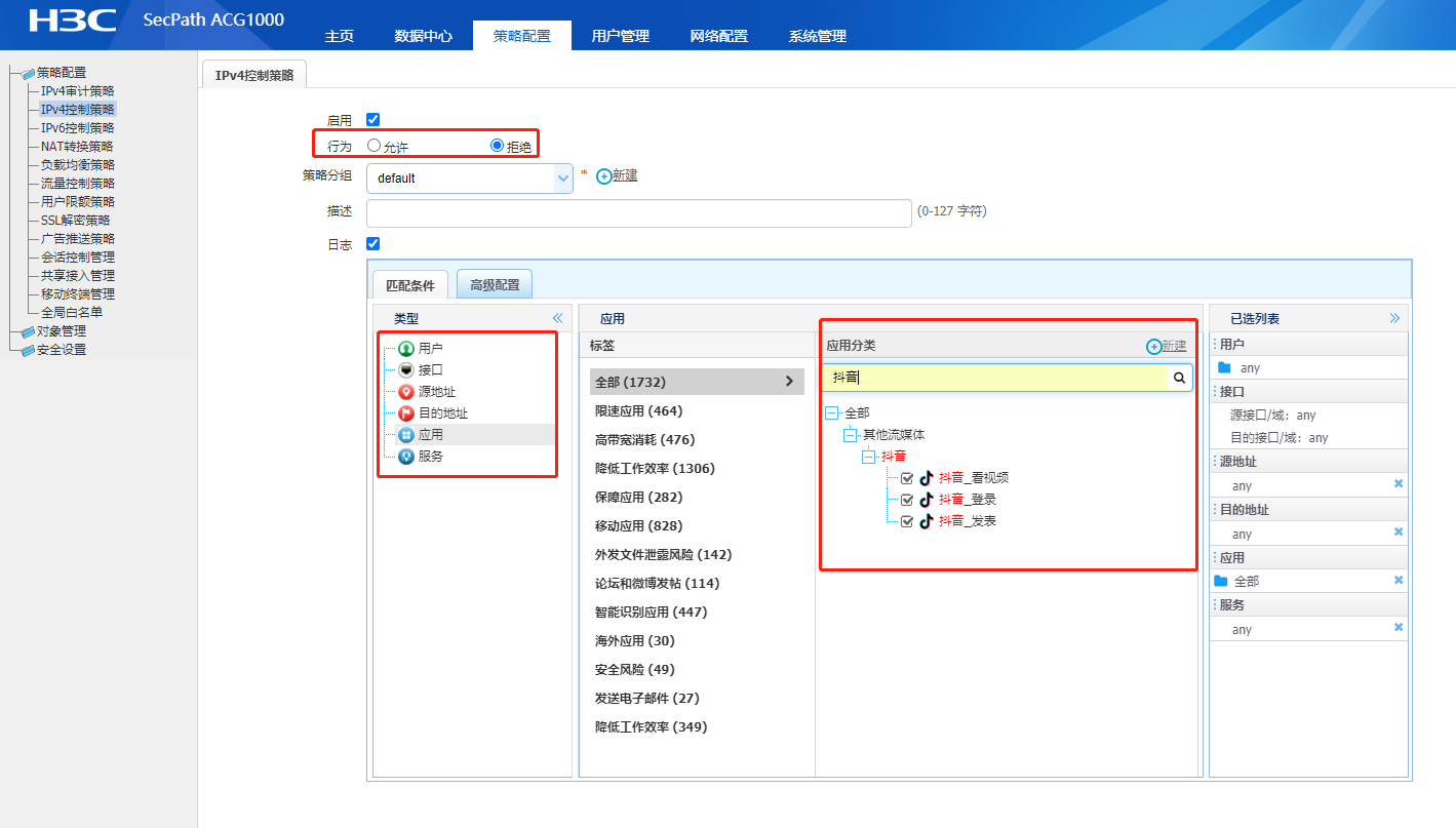 配置IPV4控制拒绝策略,配置相关d匹配条件,应用选择搜索抖音,动作拒绝