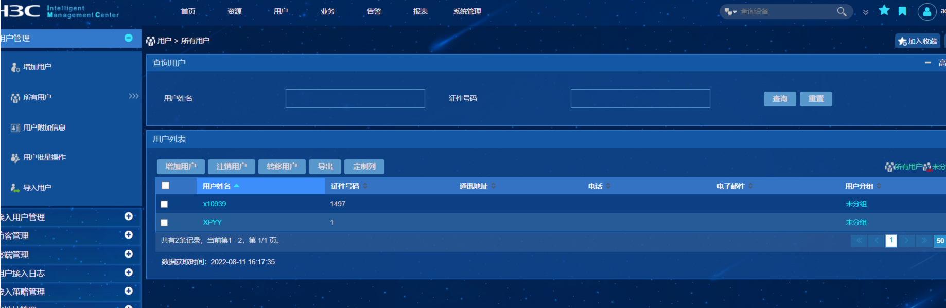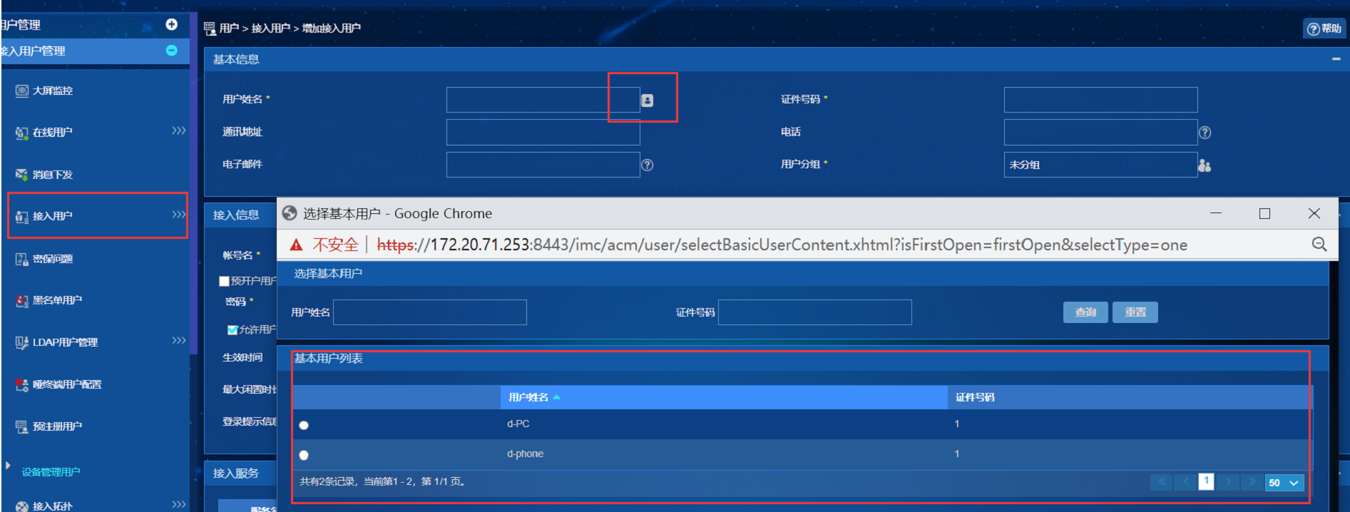 这个是两个模块,认证用户在接入用户里面添加,不要在用户管理里面添加