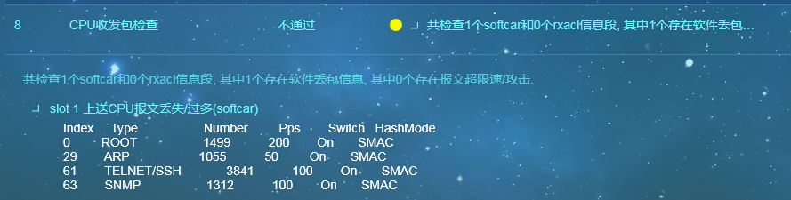 <![CDATA[共检查1个softcar和0个rxacl信息段, 其中1个存在软件丢包信息, 其中0个存在报文超限速/攻击.]]> </content> -<solution> <![CDATA[]]> </solution> -<node> <class>warn</class> -<content> <![CDATA[slot 1 上送CPU报文丢失/过多(softcar)]]> </content> -<solution> <![CDATA[ 1. 上送CPU报文丢失会导致相关协议运行超时,占用cpu带宽,对设备稳定运行存在较大隐患。也说明网络肯定存在不正常的情况。 2. DisPkt_All列表示丢弃报文数量。如果该值较多(比如大于1000),说明网络中该类报文对应协议/业务存在隐患。需要通过镜像,流统等方式确认报文来源。 3. 收集信息并寻求技术支持。]]> </solution>