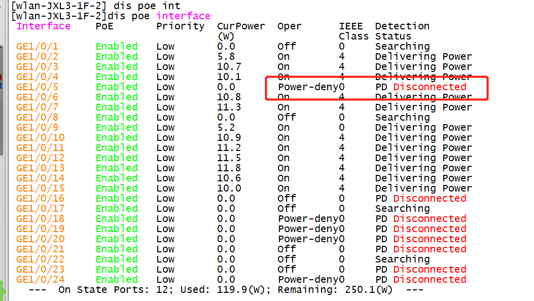交换机断电重启过后出现poe供电异常,多个接口无法正常供电,重新开关poe无法解决。