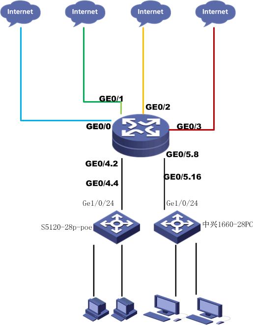 4条100M ADSL联通宽带连接到MSR2600的GE0/0~GE0/3接口,MSR2600 GE0/4配置子接口0/4.2,0/4.4,GE0/5配置子接口0/5.8,0/5.16