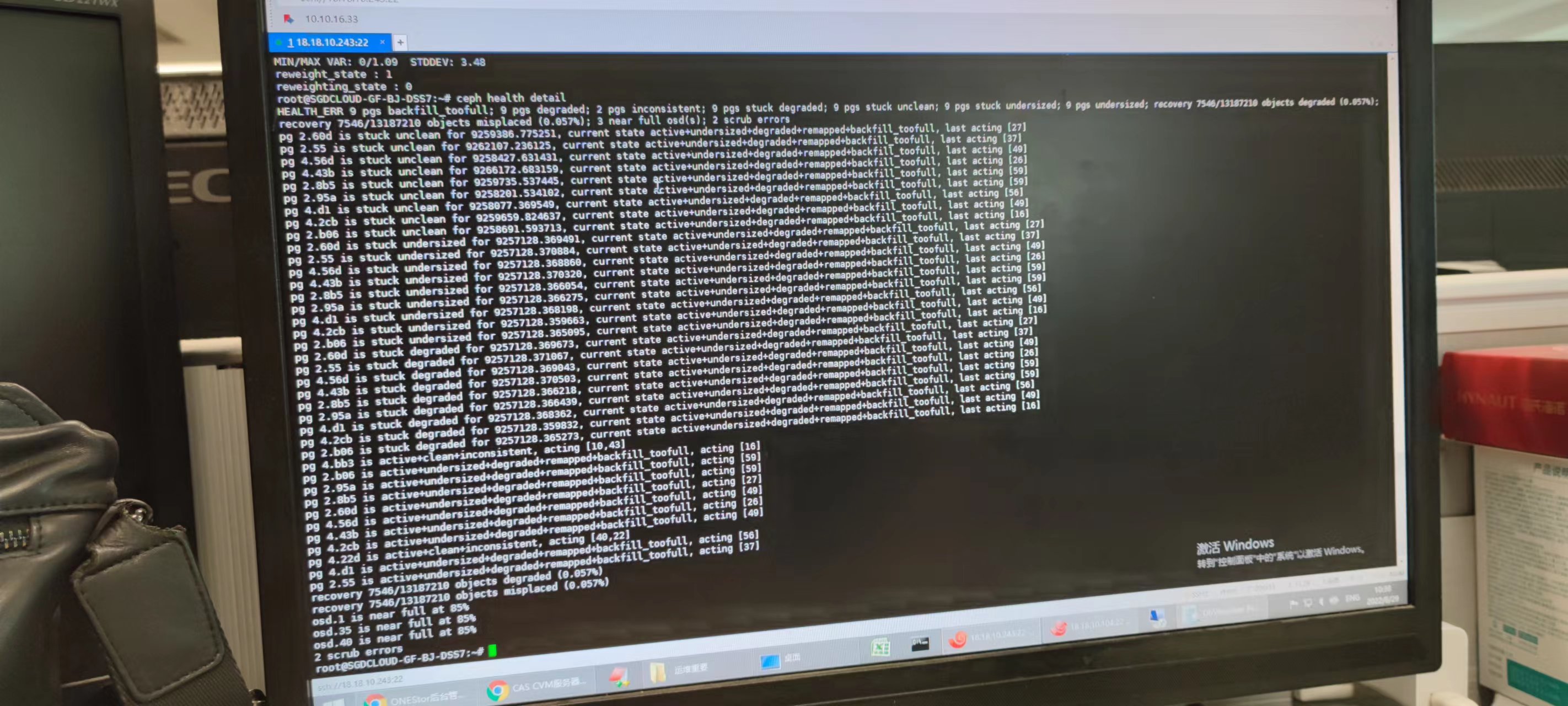坏了一个osd,然后前台数据健康度99,但是告警中pg9始终没有均衡玩,osd的阈值是95%,按理说可以正常均衡啊。