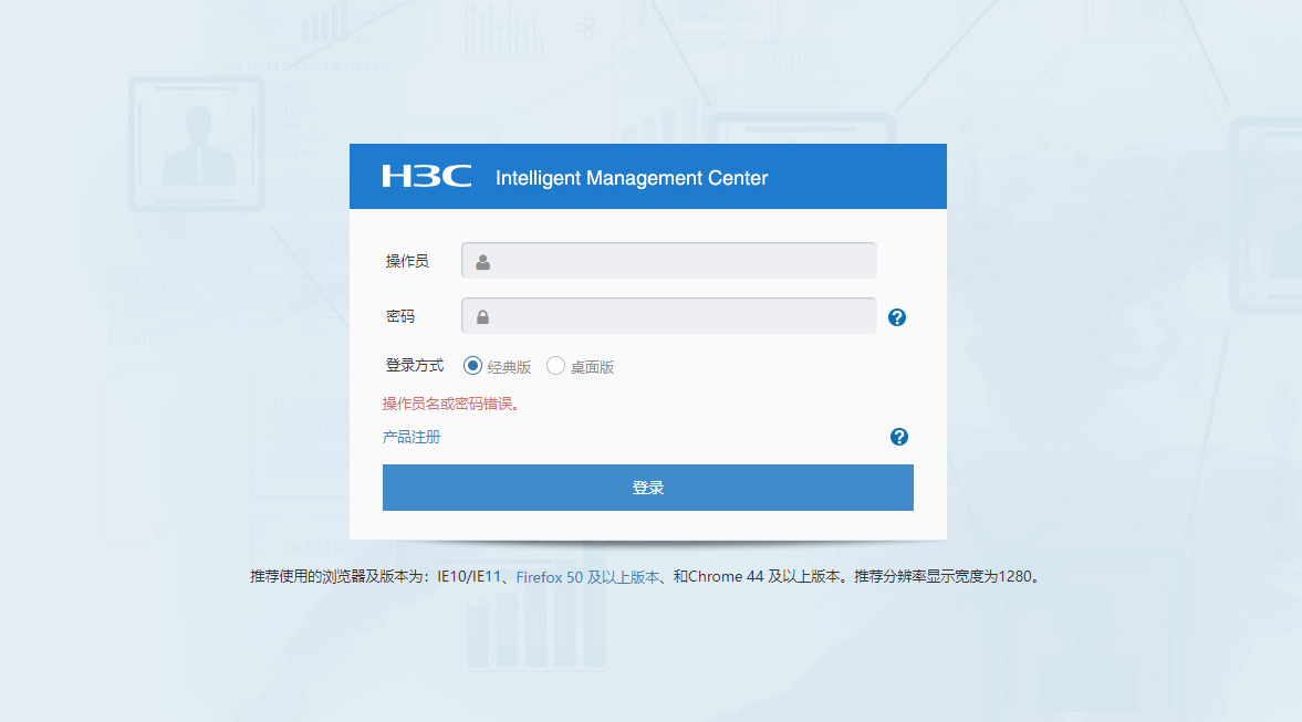 解决办法:Windows环境中使用命令resetpwd.bat(Linux环境中使用命令resetpwd.sh)将admin帐号的密码重置为默认密码。iMC PLAT 7.3 (E0706)版本前默认密码是admin,iMC PLAT 7.3 (E0706)及后续版本默认密码是Pwd@12345。