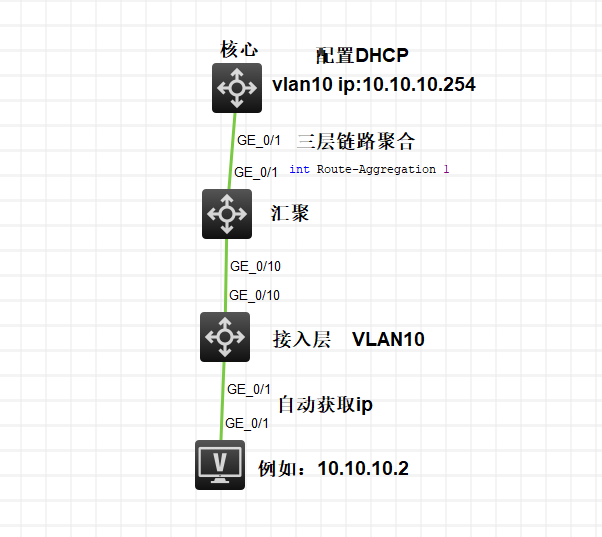 核心配置DHCP服务器,汇聚采用三层链路聚合到核心,接入层连接汇聚,PC怎么自动获取到核心的DHCP