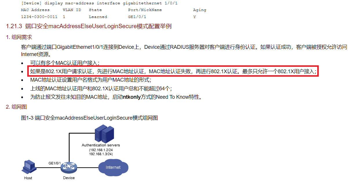 · 如果是802.1X用户请求认证,先进行MAC地址认证,MAC地址认证失败,再进行802.1X认证。802.1X用户限制为1个;
