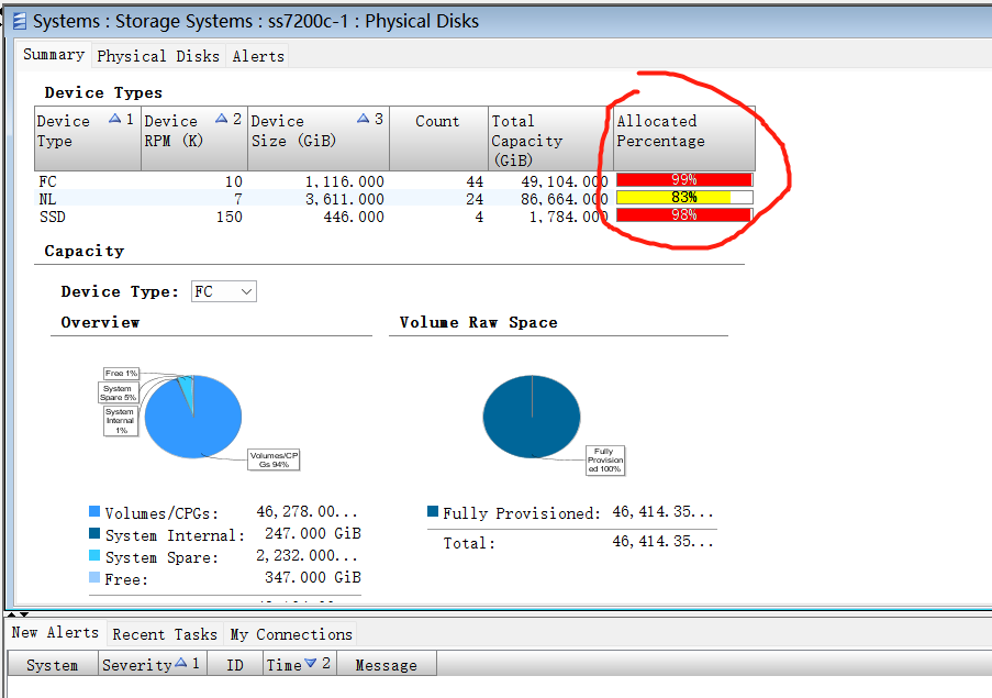 代表已经分配的磁盘利用率已经超过阈值了,这种情况要检查一下VV的置备方式,假如是精简置备的话,随着数据的不断增长,剩余的磁盘空间会被完全占用,就会发生I/O中断,在完全耗完之前需要尽快扩容硬盘;假如是完全置备的话,情况还好点,但建议还是建议磁盘