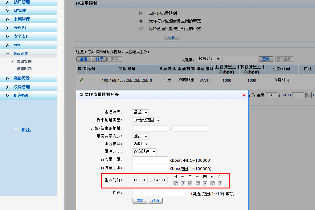 在qos章节里设置限速的时候,有时间段选择的地方吗,像下边这个,我们这个是有的,是ER8300G2的设备,如果没有的话,估计不行了,这设备,所有都是在web上做的: