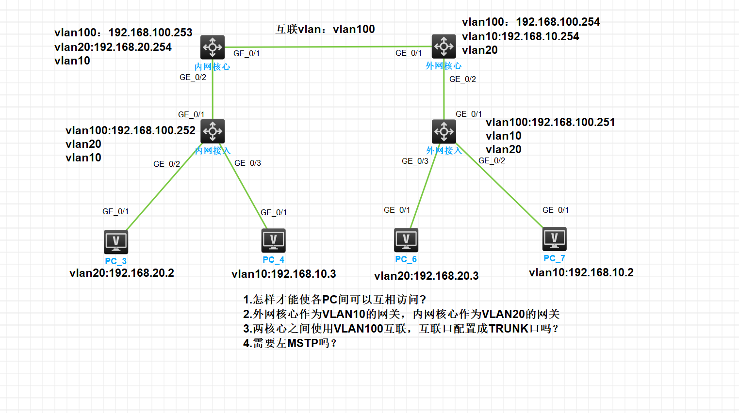 1、因为你的vlan 10和20 分别在两个核心上,那么你两个核心互联的接口配置trunk 模式,允许vlan 10 20 100通过。