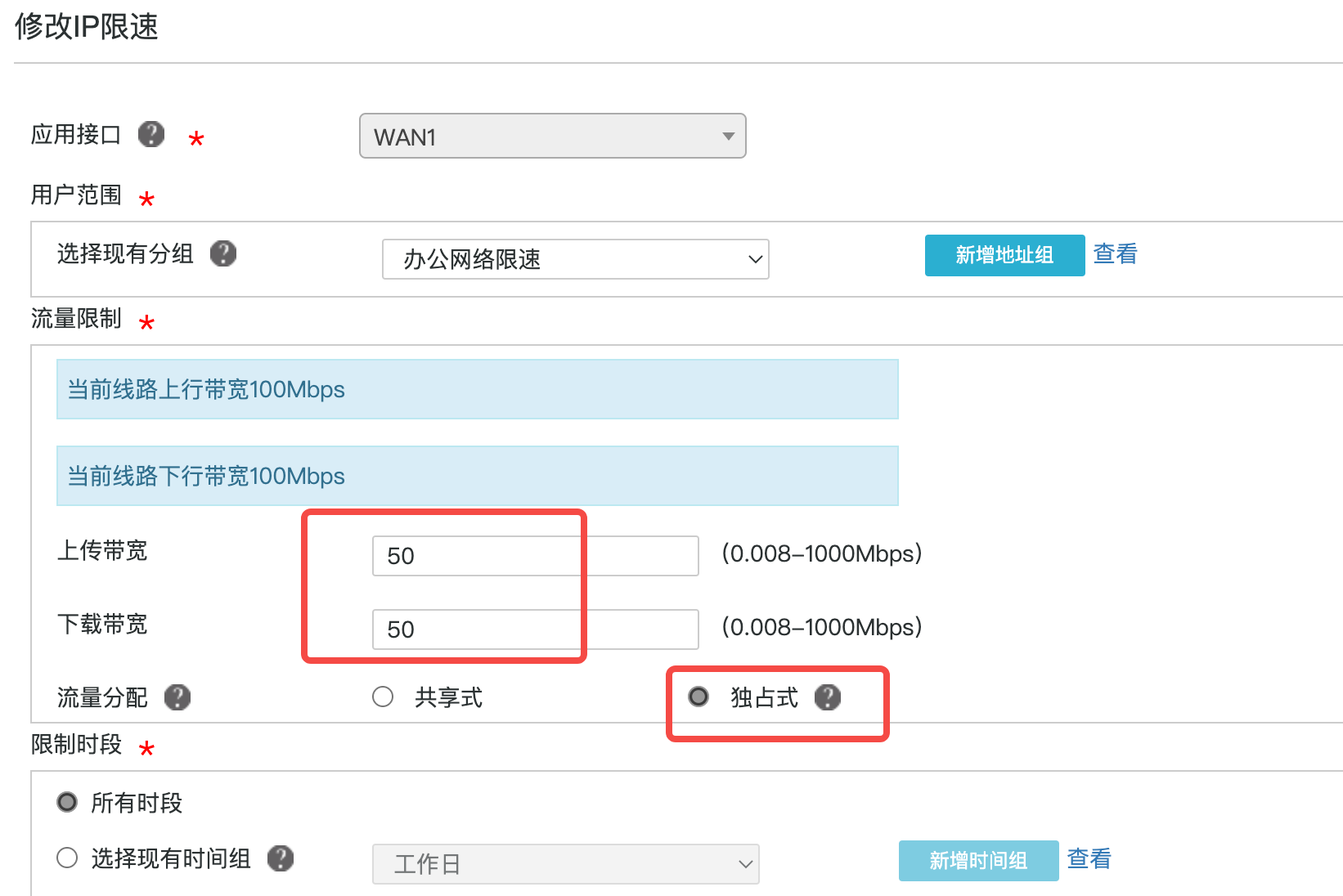共享式:分配的带宽为总带宽,由所有用户平均分配。其中弹性共享表示当用户实际流量带宽超过流量限制配置的带宽时,最大可以共享当前线路上下行带宽的百分比。 - 独占式:分配的带宽为单用户的带宽,由单个用户独享。