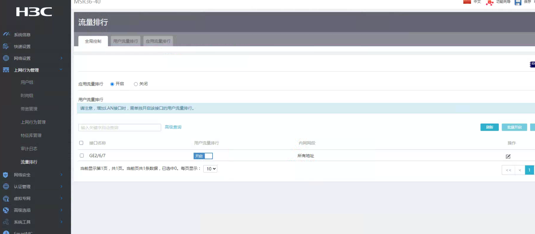 (1) 增加LAN接口时,需要单独开启该接口的用户流量排行。
