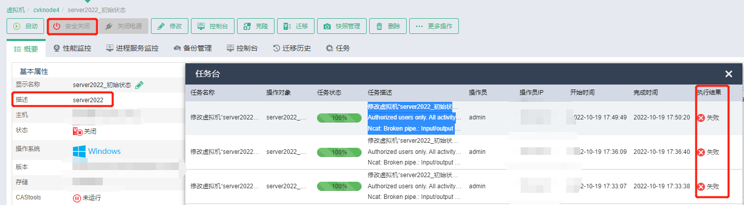 修改虚拟机“server2022_初始状态”配置失败。原因:End of file while reading data: Warning: Permanently added '10.1.2.14' (ECDSA) to the list of known hosts. Authorized users only. All activity may be monitored and reported Ncat: Broken pipe.: Input/output error