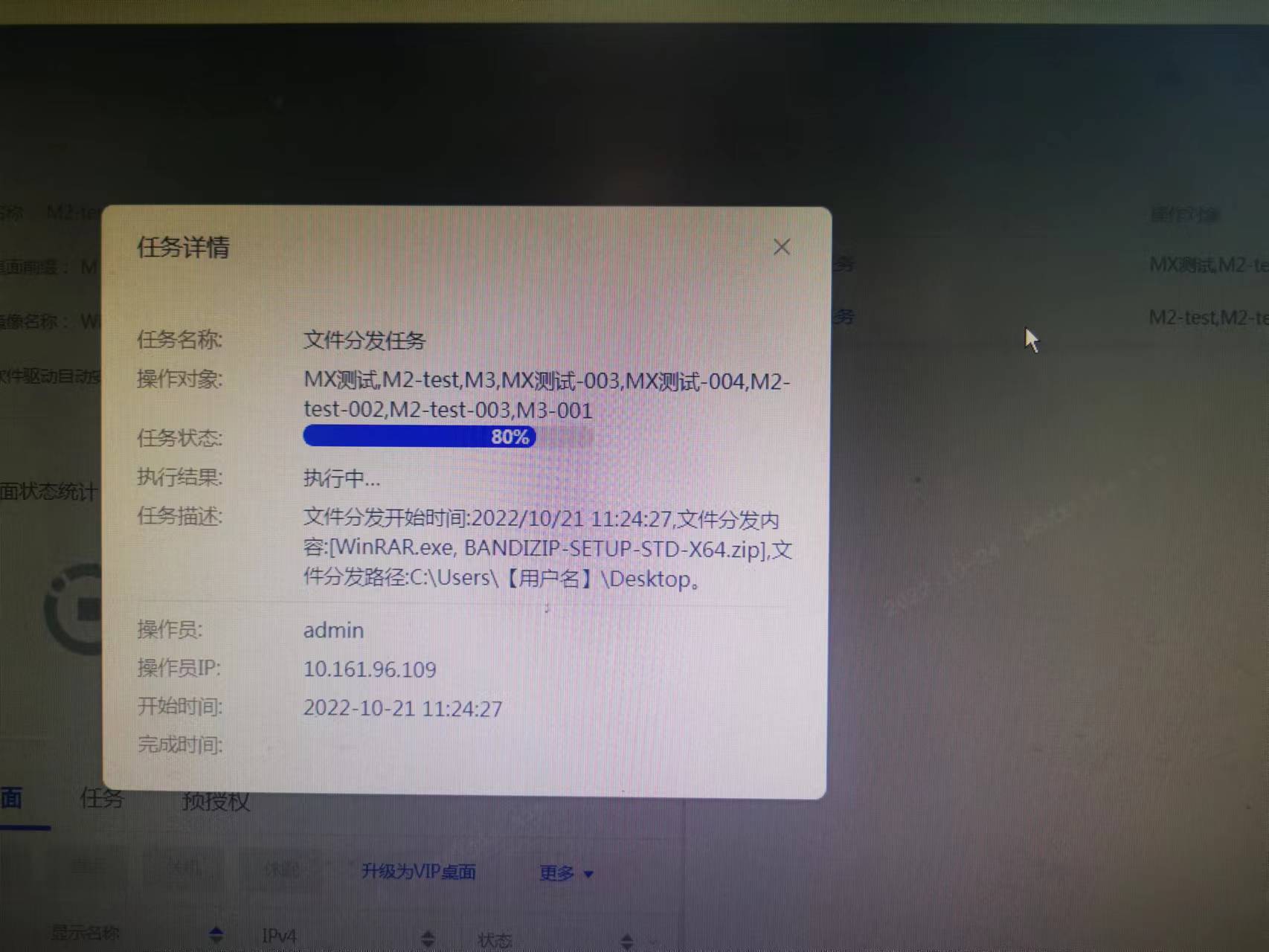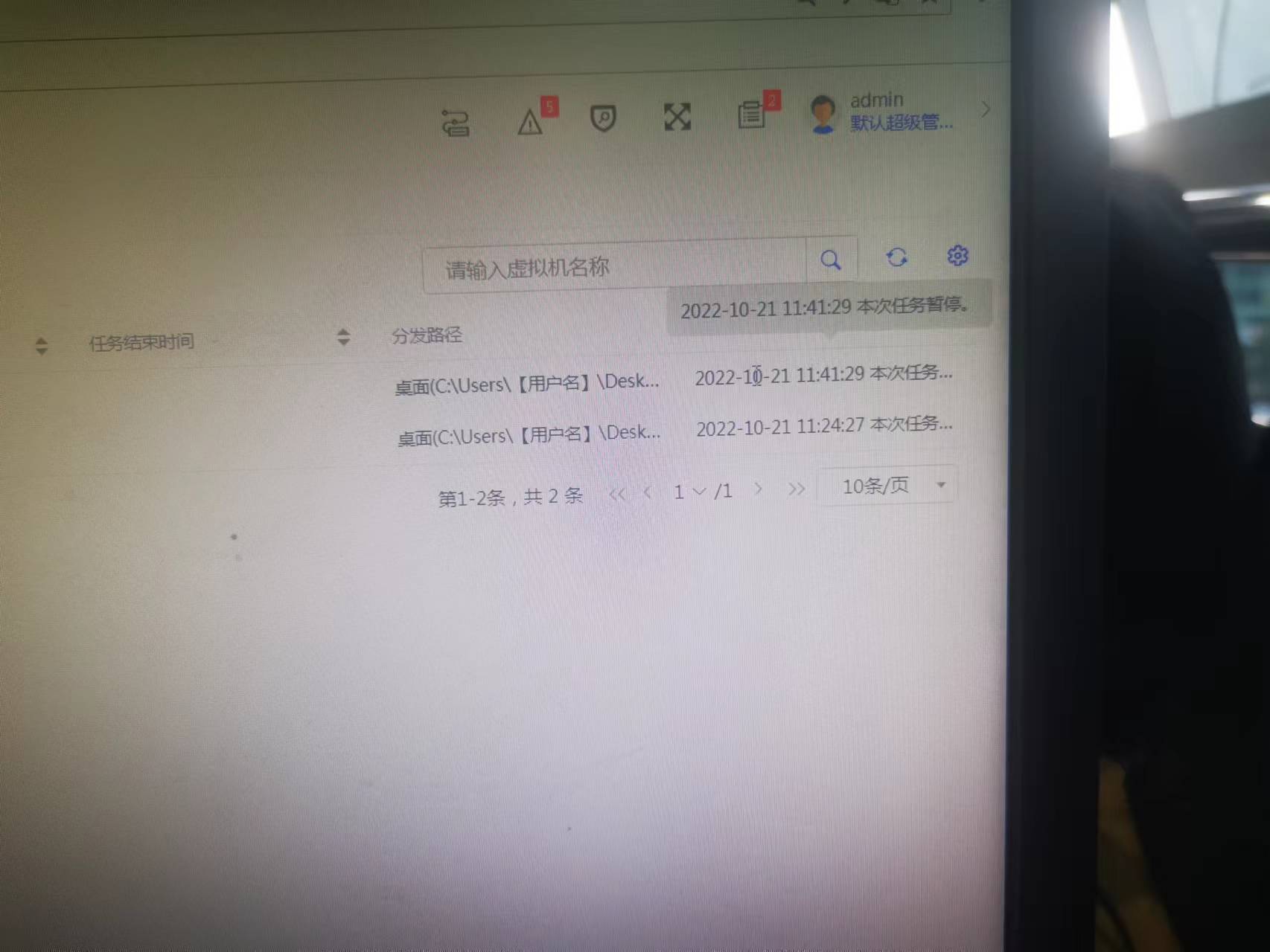 在测试文件分发的过程中,任务条一直是这个进度,任务开始时间是上周五,今天来看,进度仍然是这么多,并且在分发任务详情页面中,任务的状态,提示是“本次任务暂停”,请问有什么办法终止这两条任务?已经重启过Tomcat8,而且已经把需要接收文件的虚拟机给删除了,但是任务依然挂着的