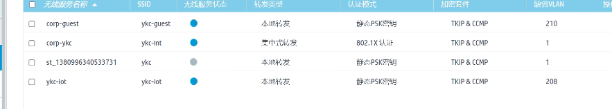 问题:ssid(corp-ykc)这个业务vlan是vlan1 的ssid,本地转发后接入终端拿不到地址,集中转发可以获取到地址