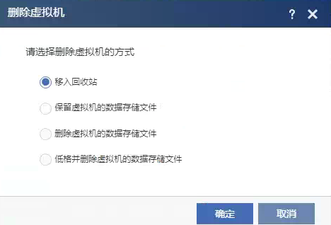 选择删除虚拟机的方式,包括移入回收站、保留虚拟机的数据存储文件、删除虚拟机的数据存储文件。