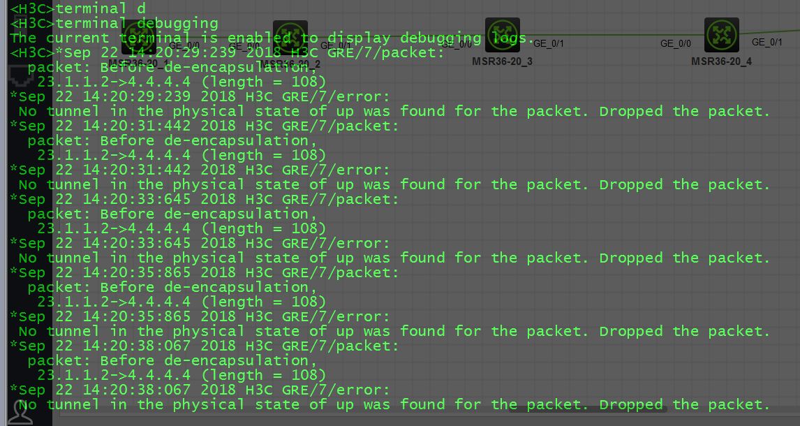 现在我的疑惑是tunnel接口所配置的IP地址会影响R1物理接口pingR5物理接口的结果,现在现在图示tunne两端源和目的地址不是按对称来的,我在R2上用ping -a 23.1.1.2 34.1.1.4 ,在R4上用ping -a 4.4.4.4 23.1.1.2全部可以互通。但是在R1上去pingR5物理接口不通。我开了debugging显示结果如2图。
