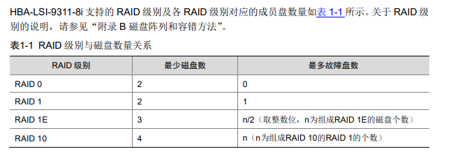 BA-LSI-9311-8i 支持的 RAID 级别及各 RAID 级别对应的成员盘数量如表 1-1 所示。关于 RAID 级 别的说明,请参见“附录 B 磁盘阵列和容错方法”。 表1-1 RAID 级别与磁盘数量关系 RAID 级别 最少磁盘数 最多故障盘数 RAID 0 2 0 RAID 1 2 1 RAID 1E 3 n/2(取整数位,n为组成RAID 1E的磁盘个数) RAID 10 4 n(n为组成RAID 10的RAID 1的个数