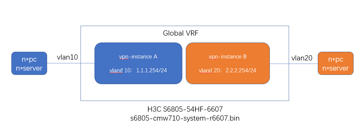 本交换机上有两个vpn-instance A和B,vpn-instance A有一个网段1.1.1.0/24及网关vlanif10,vpn-instance B有一个网段2.2.2.0/24及网关vlanif20。如何配置路由泄露使两个vpn-instance的两个网段互通。