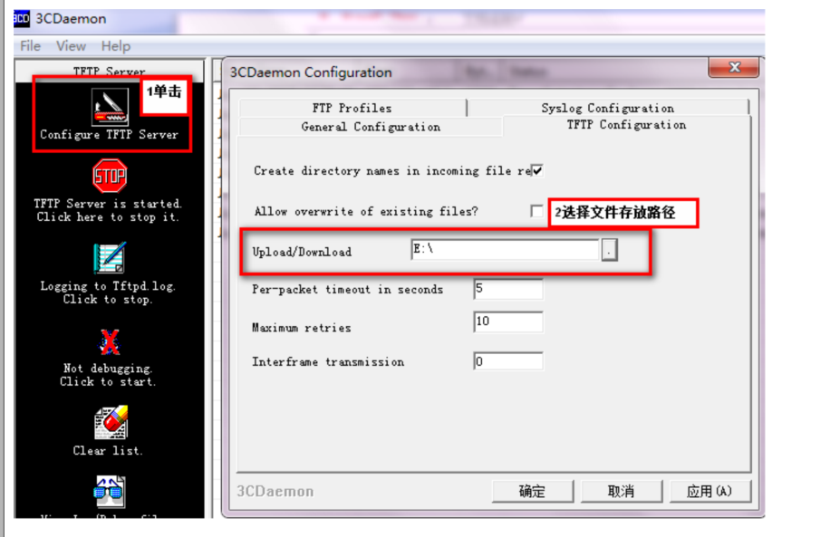 给设备和电脑配置成同网段Ip地址,举例:WAC配置成192.168.100.1/24,电脑配置成192.168.100.2/24),在电脑上使用3CDaemon软件搭建TFTP服务器,打开3CDaemon服务器,目录指向电脑E盘,然后点击应用。