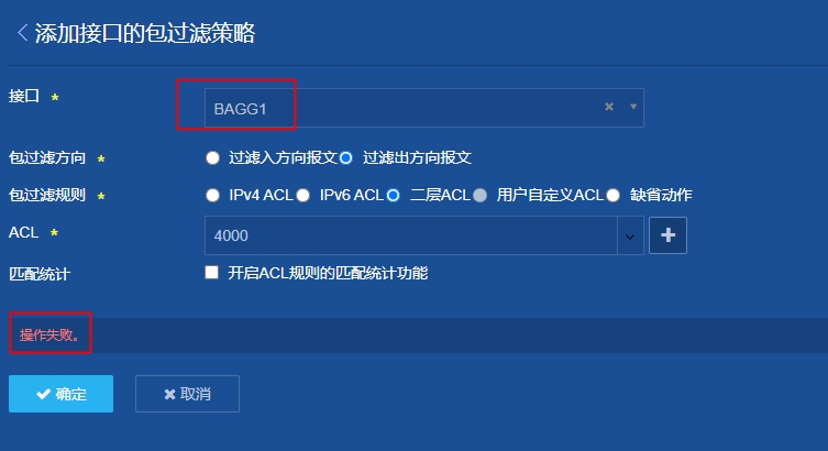 1.应用包过滤到三层交换机出接口BAGG1上,为什么提示操作失败;