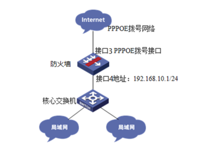 将防火墙部署在互联网出口,使用PPPOE拨号方式接入互联网。运营商提供的拨号账号为:hz123456,密码为:123456。初步规划防火墙使用3接口接入运营商,使用4接口连接内部网络,内部网络使用192.168.10.0网段,要求内网终端可以自动获取到地址并可以访问互联网。