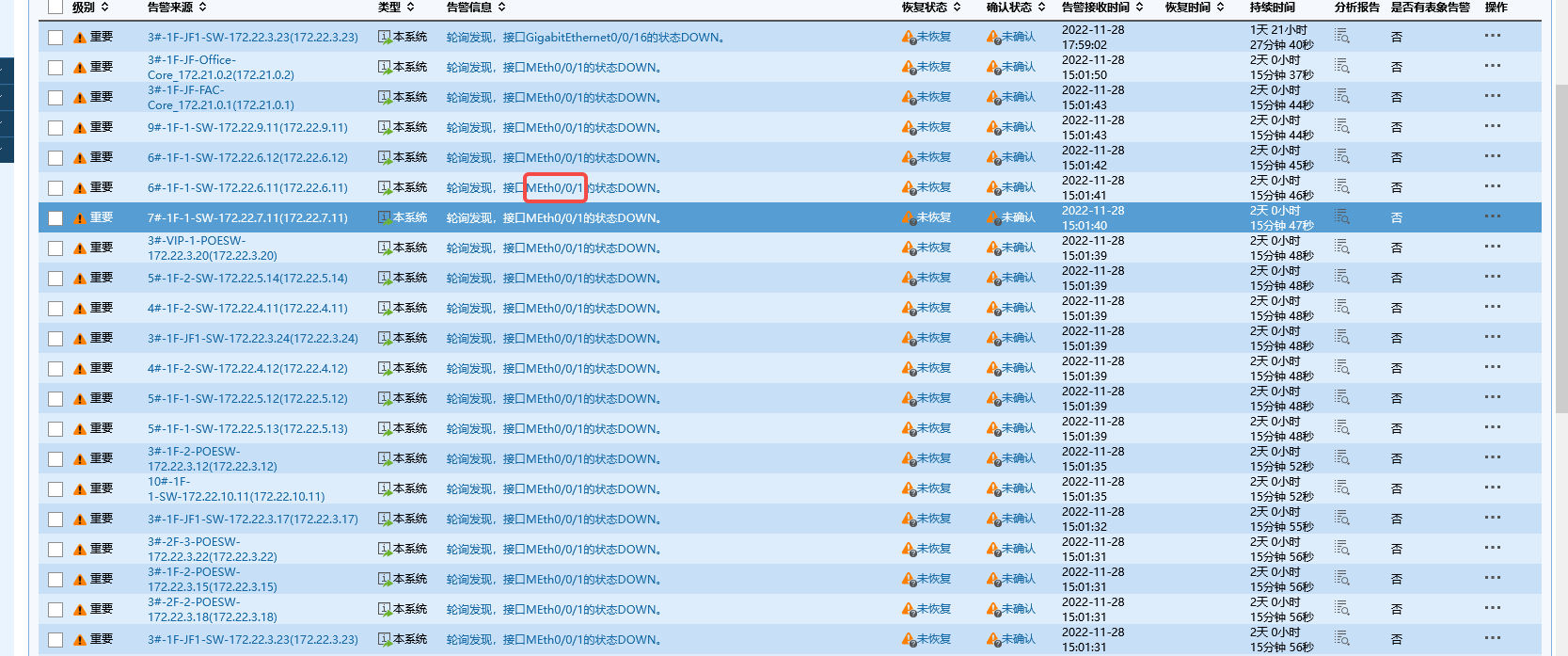 imc v7 平台采集交换机,总有硬件管理口MEth的类型的端口,是告警 DOWN的状态的。点确定之后,还会继续轮询到这个告警。