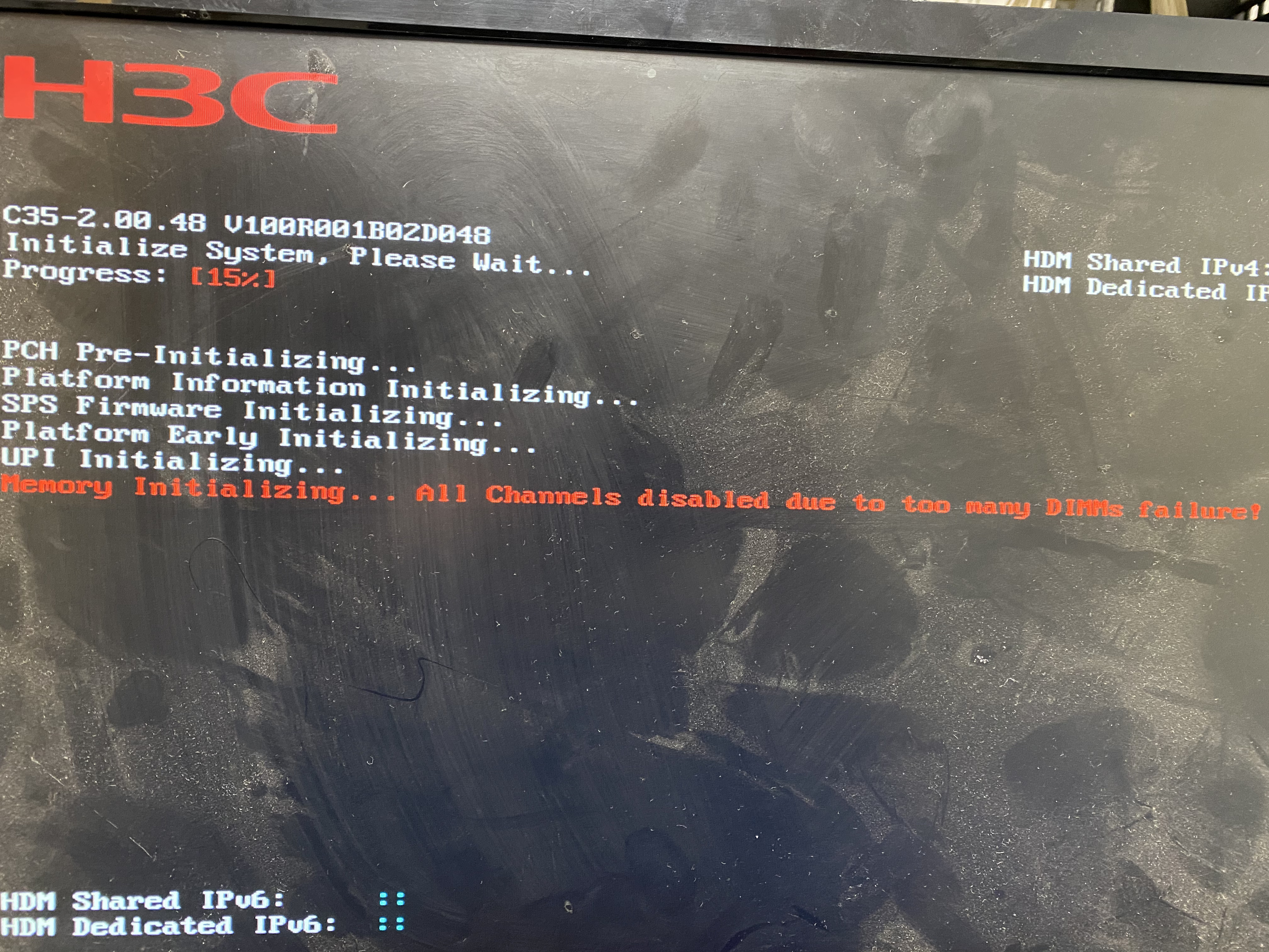 机器无法正常启动,一直停留在开机界面显示Memory initializing ..all channels disabled due to too many dimms failure