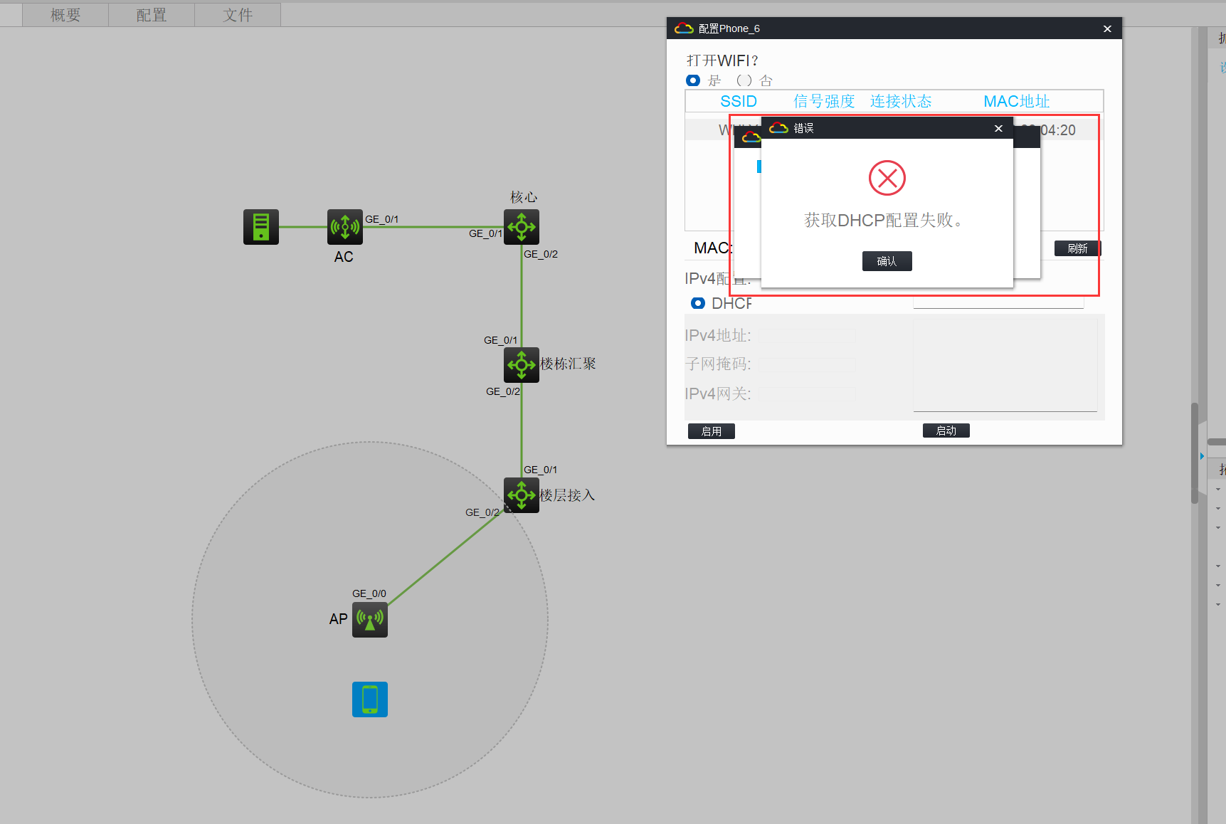 在HCL模拟器里面做无线实验,目前AP已经可以正常上线了,但是模拟手机一直无法获取到IP地址是怎么回事? AC做的是本地转发,也导入了MAP文件。