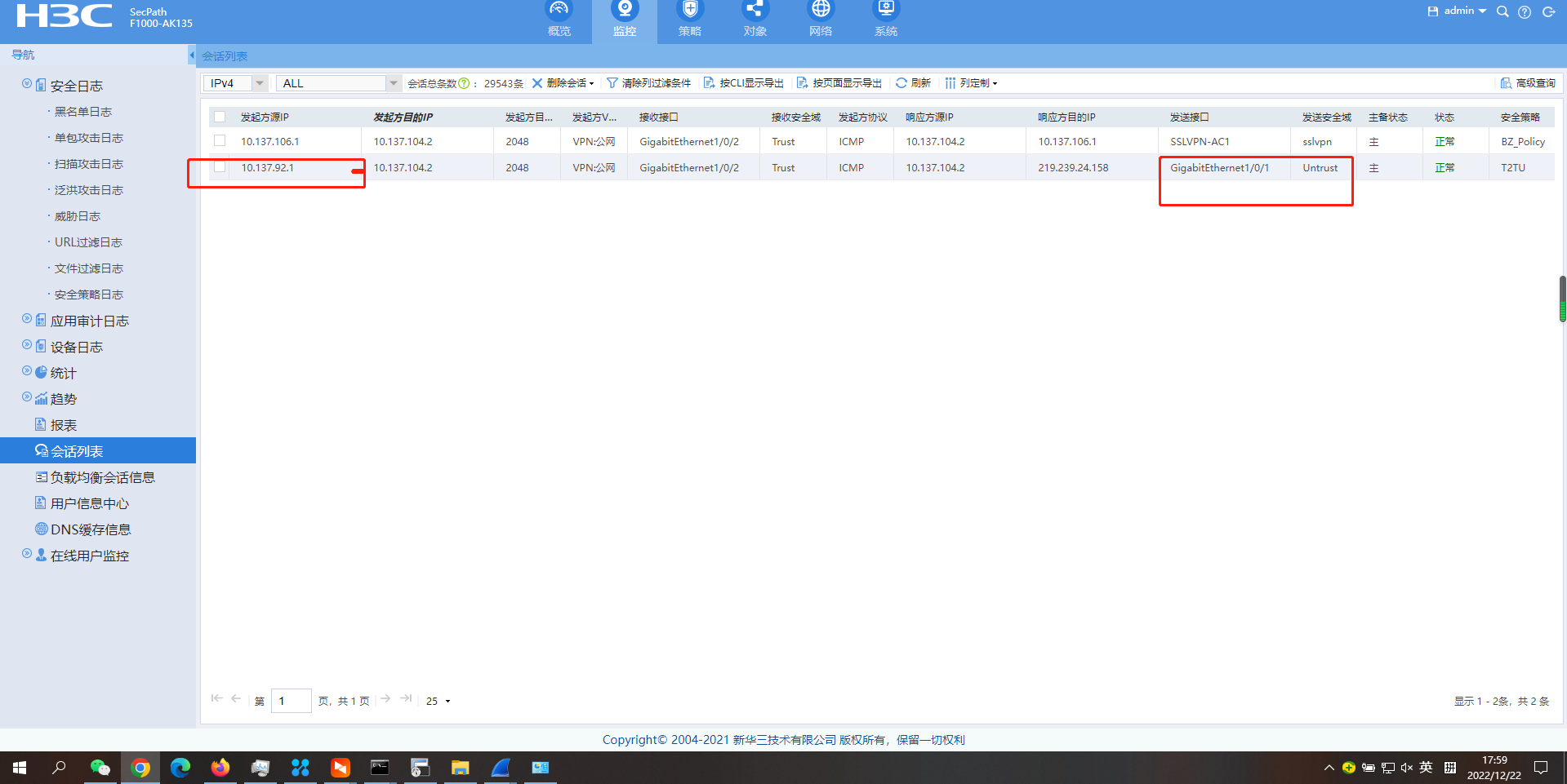 4.经查询,正常情况下,接收安全域应为sslvpn,但是在访问92.0网段时,接收安全域却是untrust