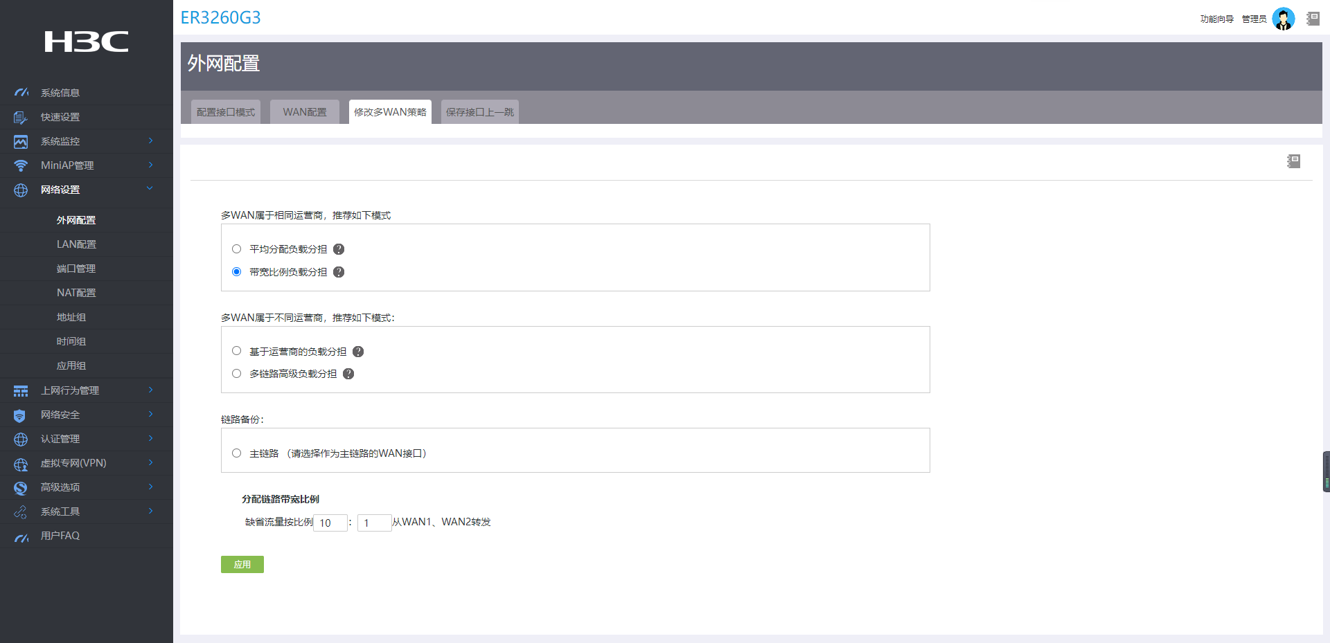 多WAN口相同运营商,按照带宽比例负载分担,比例为10:1(WAN1是1000M,WAN2是100M),所有端口模式为全双工,速率为千兆。
